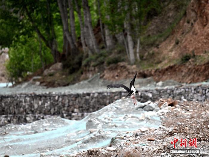 图为黑鹳在河道附近飞翔。乐都区委宣传部供图
