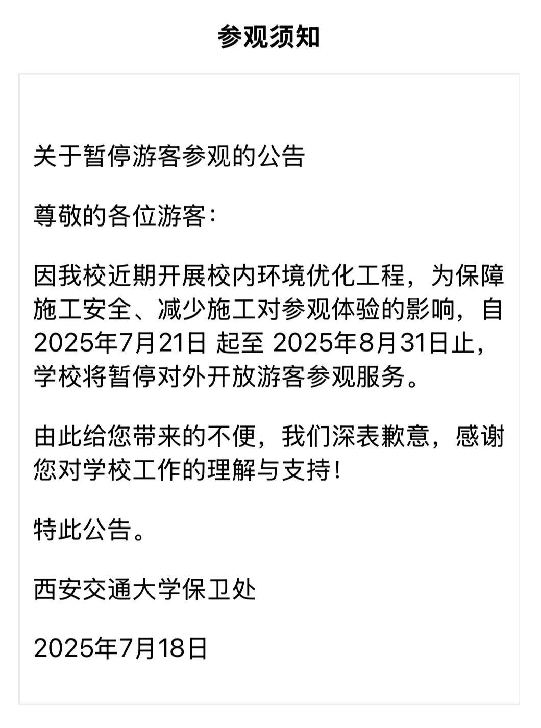 公告显示,因学校近期开展校内环境优化工程,为保障施工安全、减少施工对参观体验的影响,自2025年7月21日起至2025年8月31日止,学校暂停对外开放游客参观服务。