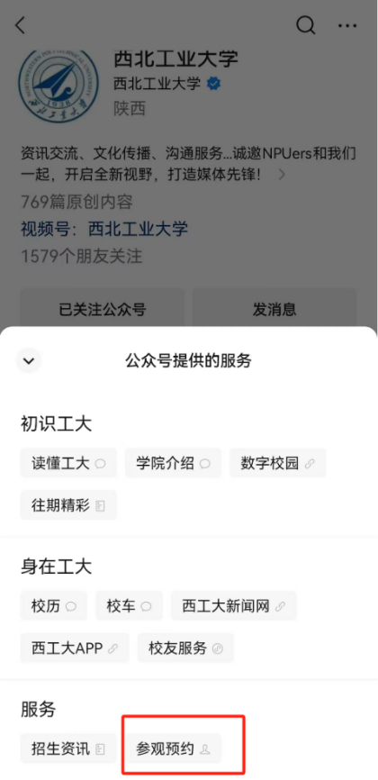 1.网上预约。访客可提前3天点击西北工业大学微信公众号“服务”通道——“参观预约”进行预约登记。