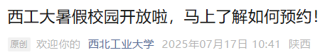 一、西北工业大学为教学科研单位,预约参观免费,个人参观预约名额严禁转让、销售、倒卖,一经发现,将严肃处理并保留追责权利。
