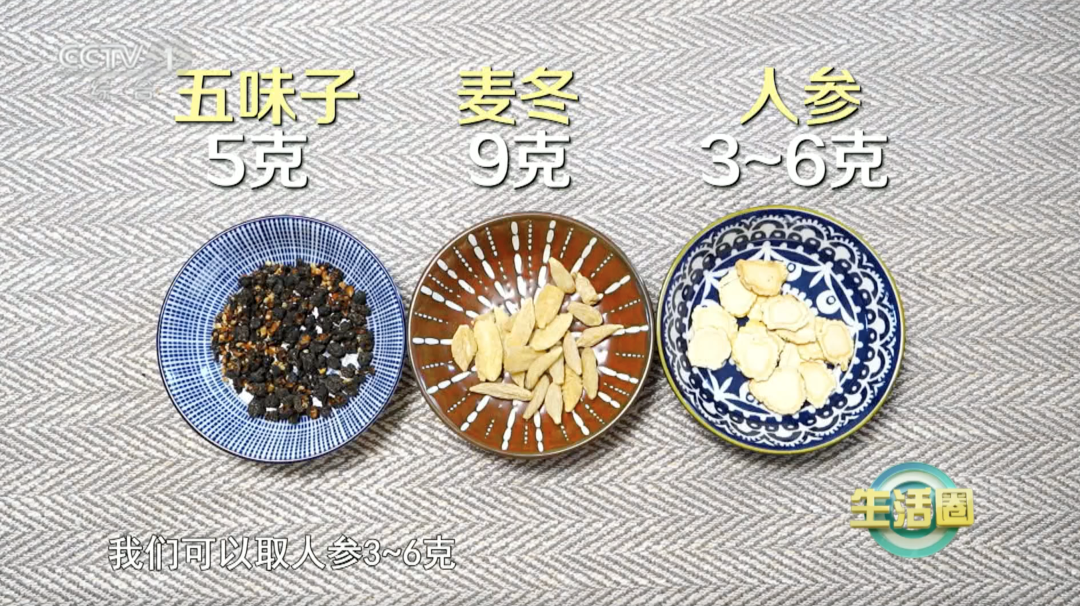 取五味子5克、麦冬9克、人参3~6克,用水煎煮20分钟即可,一周可以喝2~3次。