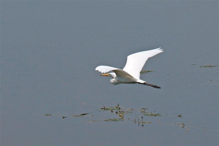 7月30日,在沣河梁家滩湿地公园,一只白鹭在水面上飞行。 (记者 谢伟 摄)