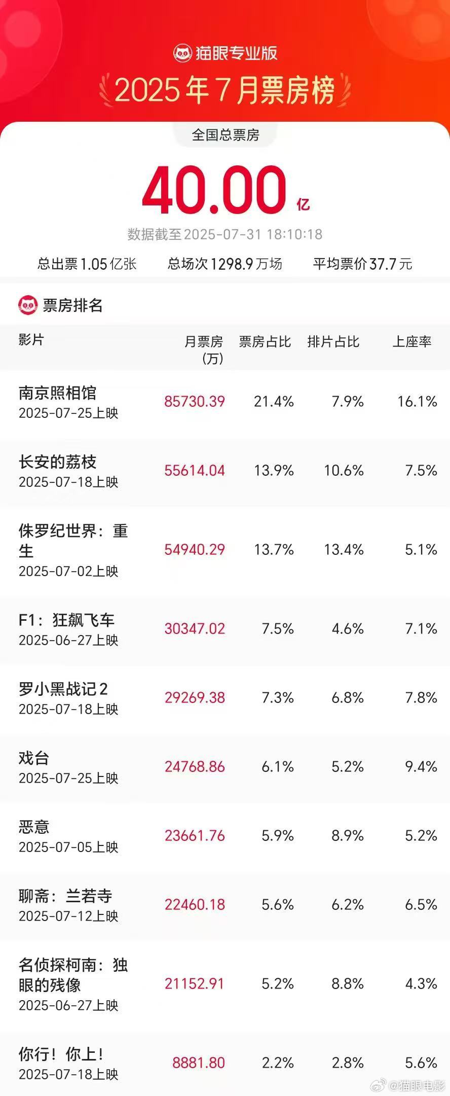 据猫眼专业版数据,7月31日18时10分,2025年7月总票房破40亿,《南京照相馆》《长安的荔枝》《侏罗纪世界:重生》分列7月票房榜前三位。