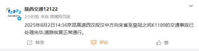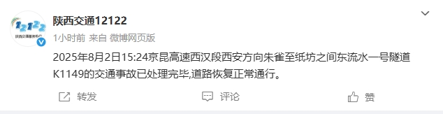 2025年8月2日15:24京昆高速西汉段西安方向朱雀至纸坊之间东流水一号隧道K1149的交通事故已处理完毕,道路恢复正常通行。