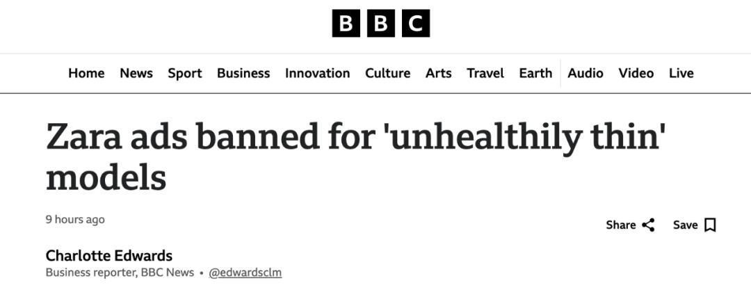 近日,时尚品牌Zara的两则广告因模特看起来“瘦得不健康”在英国被禁播。