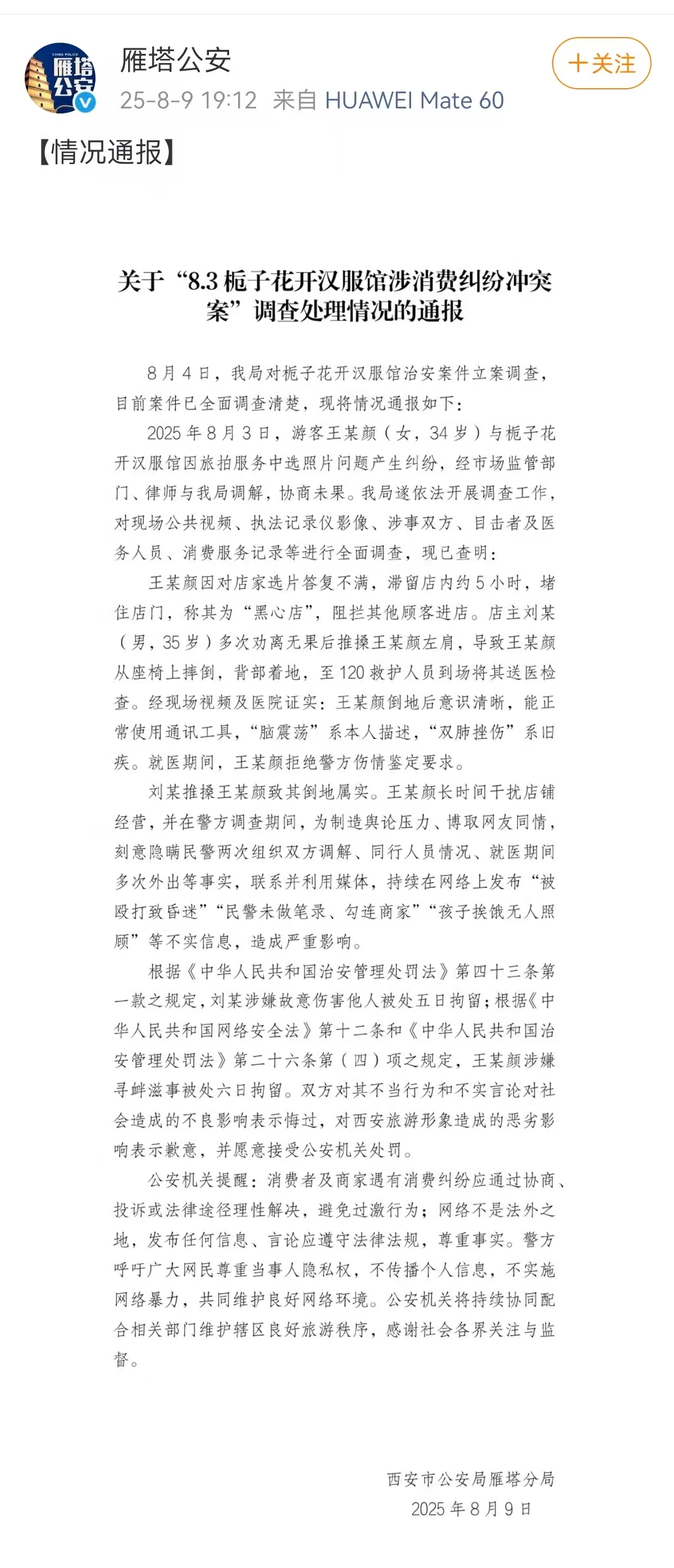 关于“8.3栀子花开汉服馆涉消费纠纷冲突案”调查处理情况的通报