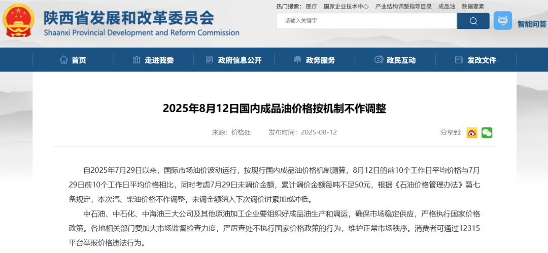 自2025年7月29日以来,国际市场油价波动运行,按现行国内成品油价格机制测算,8月12日的前10个工作日平均价格与7月29日前10个工作日平均价格相比,同时考虑7月29日未调价金额,累计调价金额每吨不足50元,根据《石油价格管理办法》第七条规定,本次汽、柴油价格不作调整,未调金额纳入下次调价时累加或冲抵。
