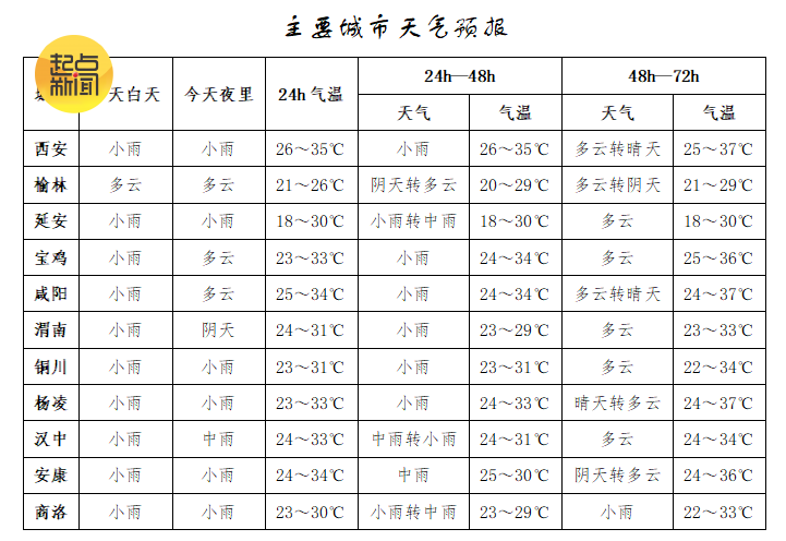 19日:陕北阴天间多云,大部分地方有小到中雨;关中、陕南晴天间多云。关中平原地区、陕南汉江河谷地带有35℃以上的高温天气,关中平原局地最高温度可达38℃。