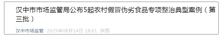 为进一步拓展群众身边不正之风和腐败问题集中整治工作成效,着力解决人民群众反映强烈的农村食品安全突出问题,切实维护消费者身体健康和合法权益。汉中市市场监管系统深入开展农村假冒伪劣食品违法行为集中打击专项行动,依法查处了一批违法案件。为发挥案件的警示教育作用,现公布第三批5起典型案件。