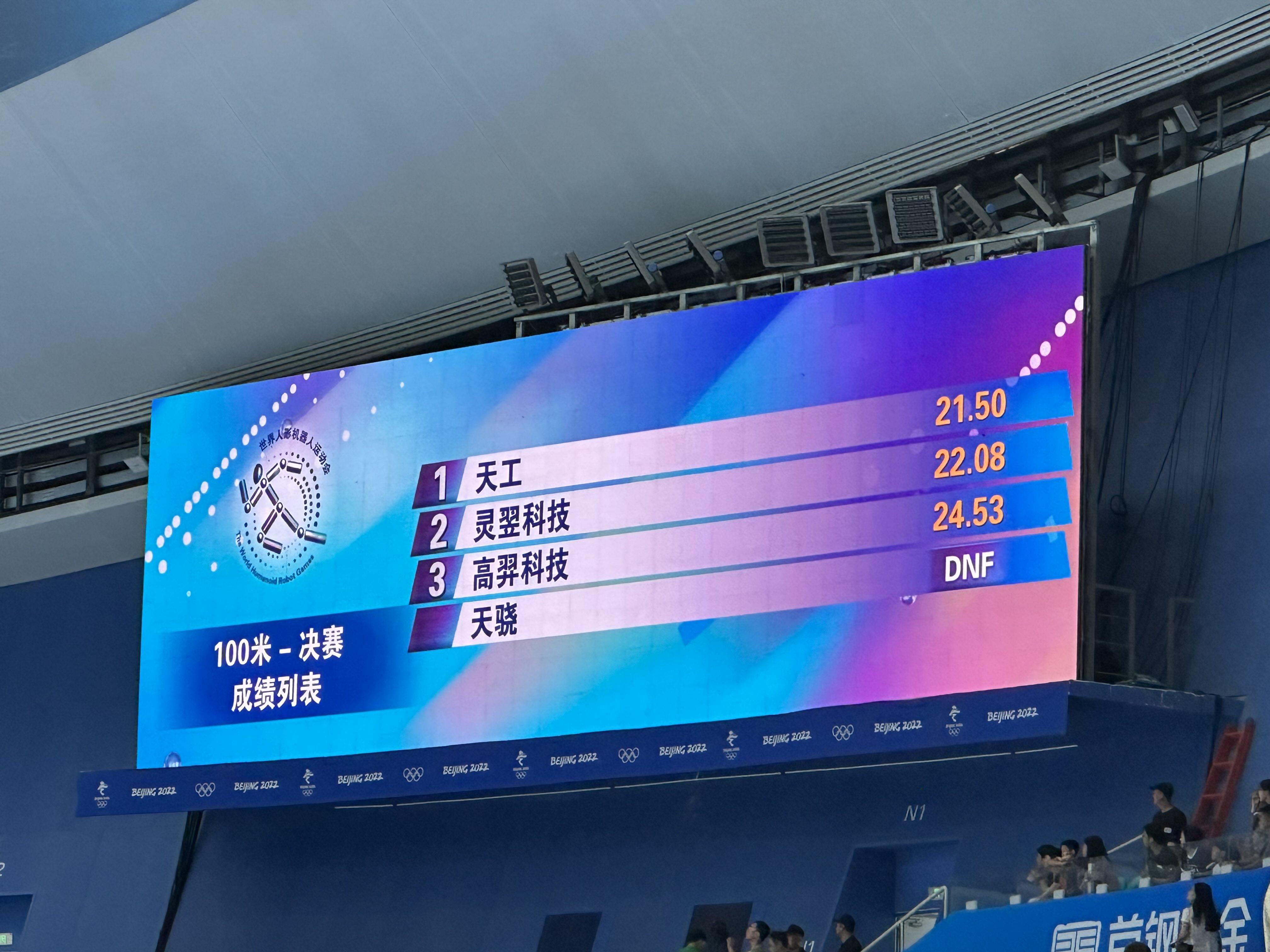 100米短跑是本次运动会上参赛选手最多、竞争最激烈的项目,共有23组90位机器人选手参加预赛。竞争异常激烈,最终仅4支队伍进入决赛。