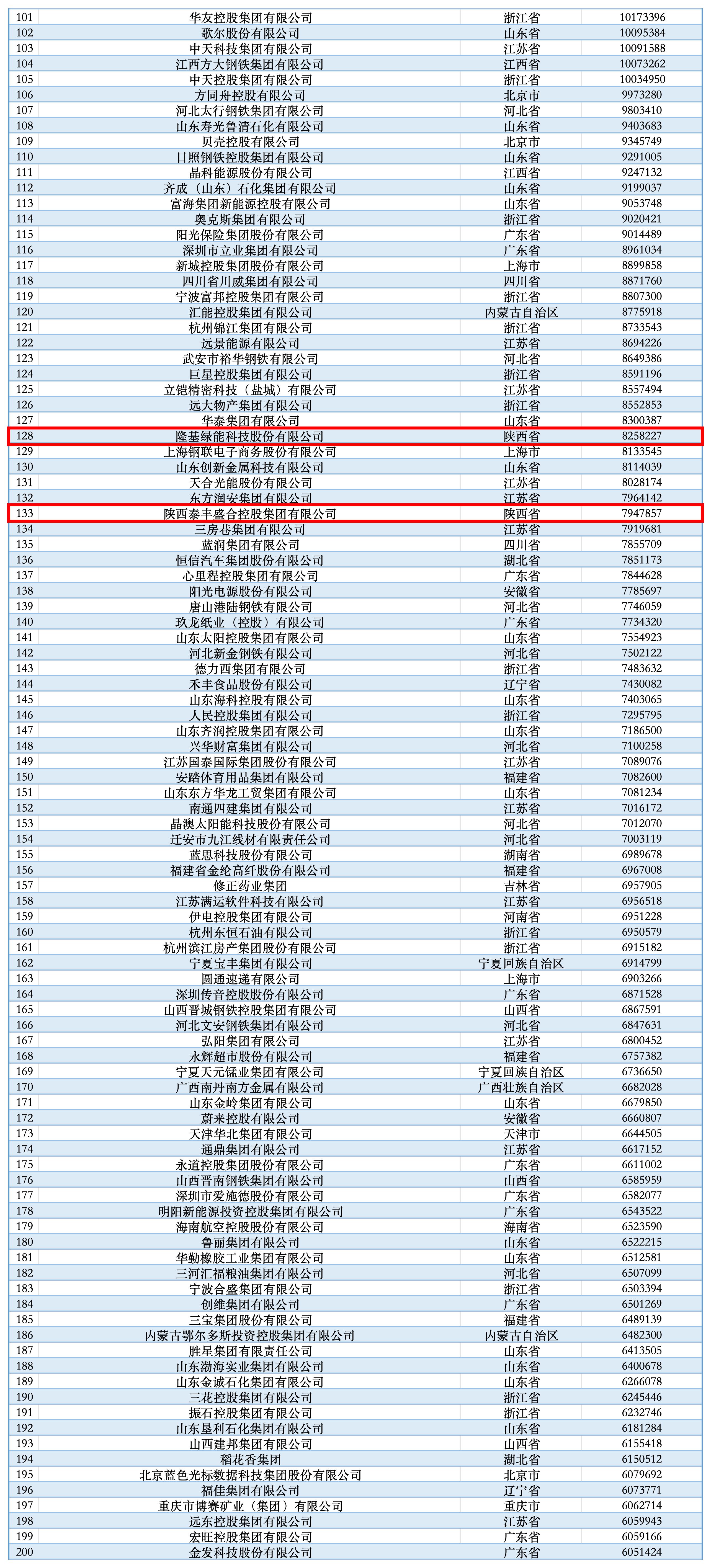 陕西入围500强的3家企业分别是:隆基绿能科技股份有限公司,排名第128位;陕西泰丰盛合控股集团有限公司,排名第133位;荣民控股集团有限公司,排名第347位。