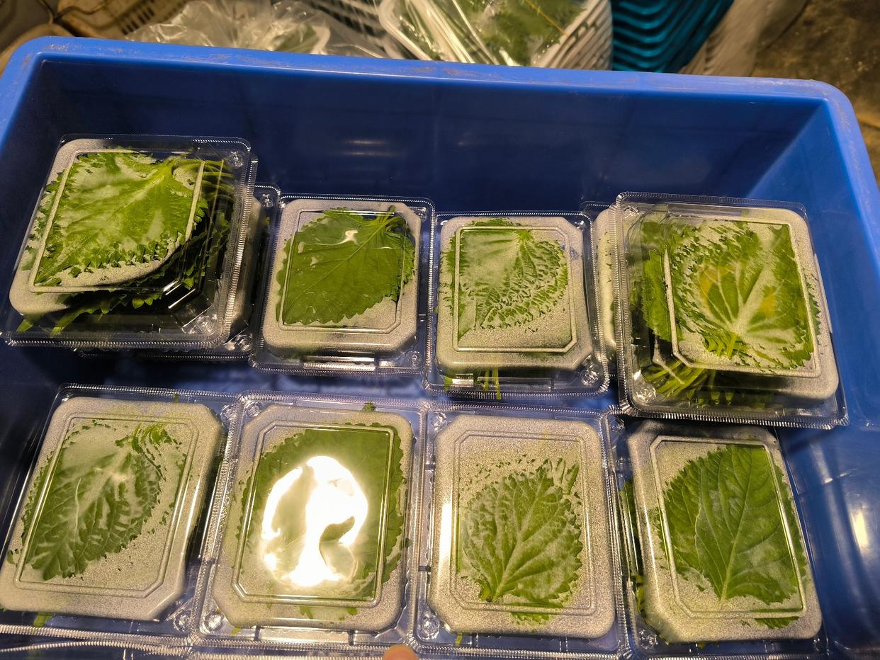 九派新闻记者看到,分拣好的叶片非常规整地排列在盒中,尽管俯视看起来只有几片,但是其实是10摞,每摞有10片,共100片。分拣完成后的紫苏叶片会立即放至冷库预冷,等待发货。目前,100片装是销量最高的规格,但也有客户要求提供单摞80片或50片的包装。“具体要看客户的使用场景和习惯。”王丽说。