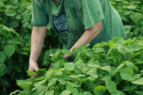 工人采摘紫苏嫩叶。