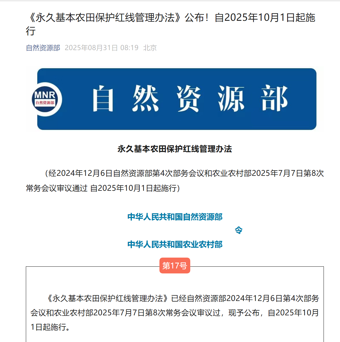 8月31日,自然资源部发布的消息显示,《永久基本农田保护红线管理办法》(以下简称《办法》)已经审议通过,将于2025年10月1日起施行。《办法》贯彻落实“坚持实行最严格的耕地保护制度”的要求,对于永久基本农田划定、管控、保护、优化调整、质量建设等作出具体规定,依法实行严格保护。同时,将建立永久基本农田“优进劣出”的管理机制作为重点,以整合调整、集中连片、提高质量为目标导向,明确了允许优化调整的情形、程序和规则,兼顾耕地保护的刚性和农业生产的灵活性。