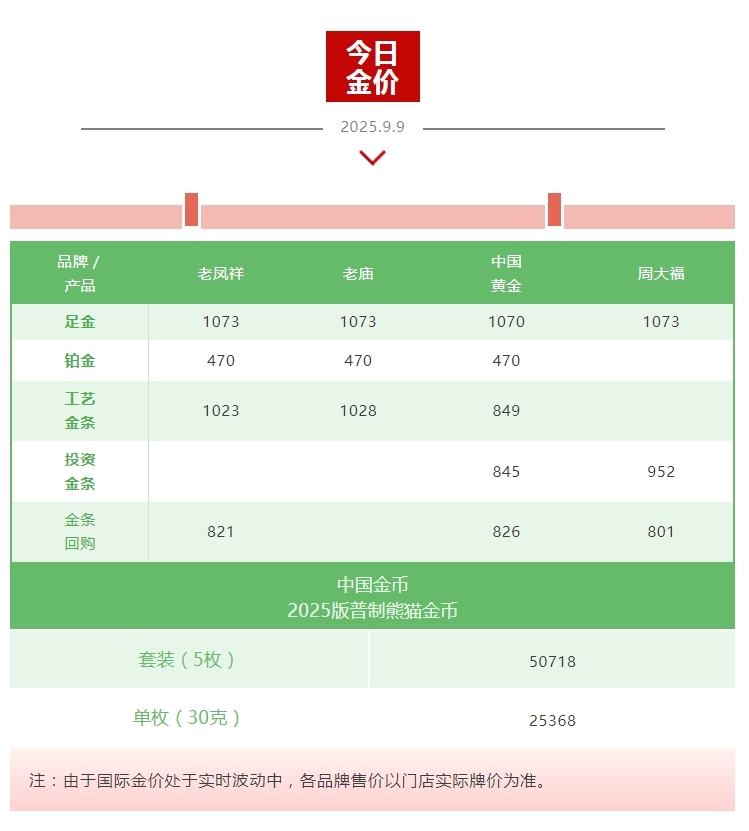 受此影响,国内金饰价格水涨船高。9月9日,老庙黄金金饰价格为1073元/克,为年内最高,单日上涨11元;老凤祥为1073元,单日上涨10元;周大福为1073元,单日涨13元;周生生金饰价格为1074元/克。