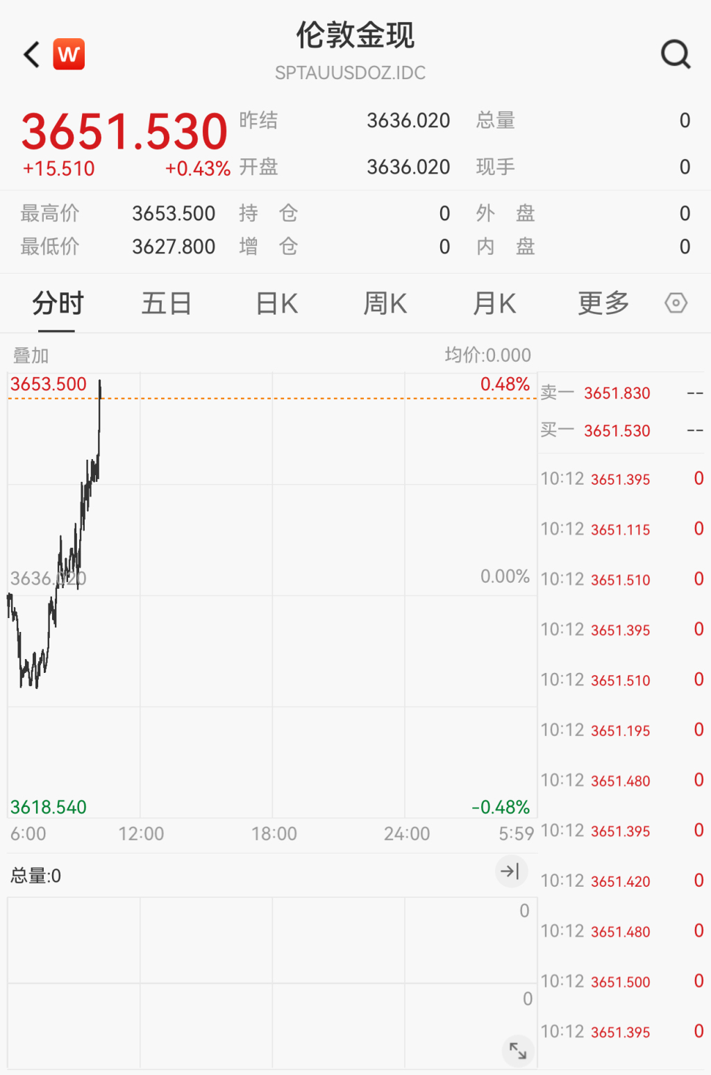 金价涨势不止,现货黄金价格突破3650美元/盎司。