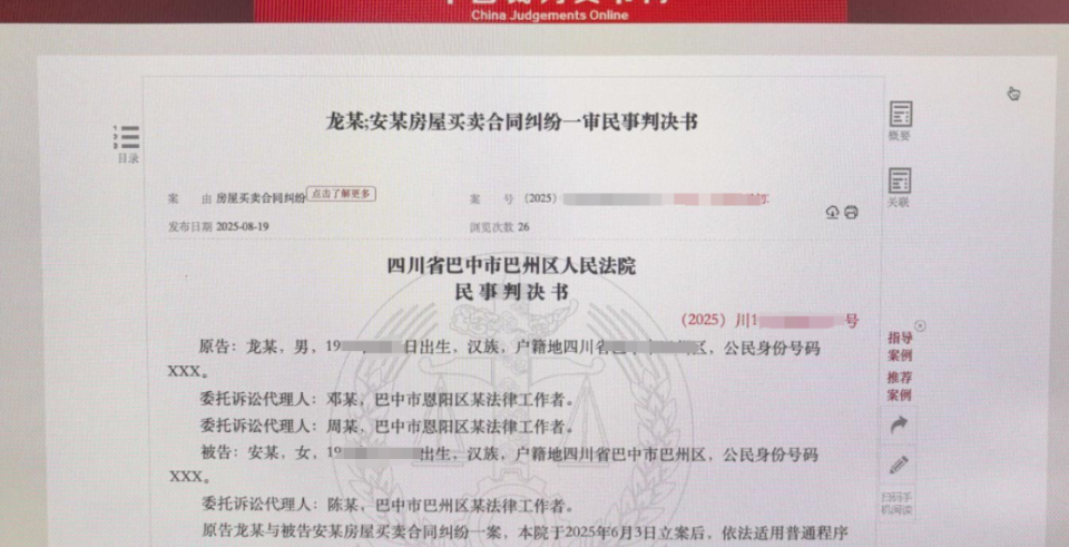 记者获悉,裁判文书网近期公布此房屋买卖合同纠纷一审判决书,四川巴中市巴州区人民法院判决,被告安某向原告龙某返还购房款12万元,并驳回龙某的其他诉讼请求。