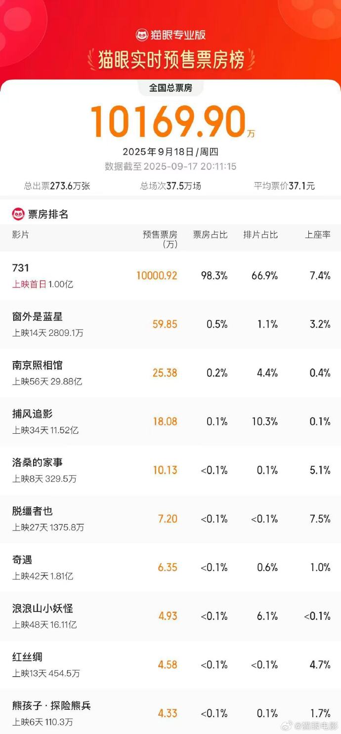 据猫眼专业版数据,电影《731》首日预售票房破亿!影片于今日(9月18日)上映。