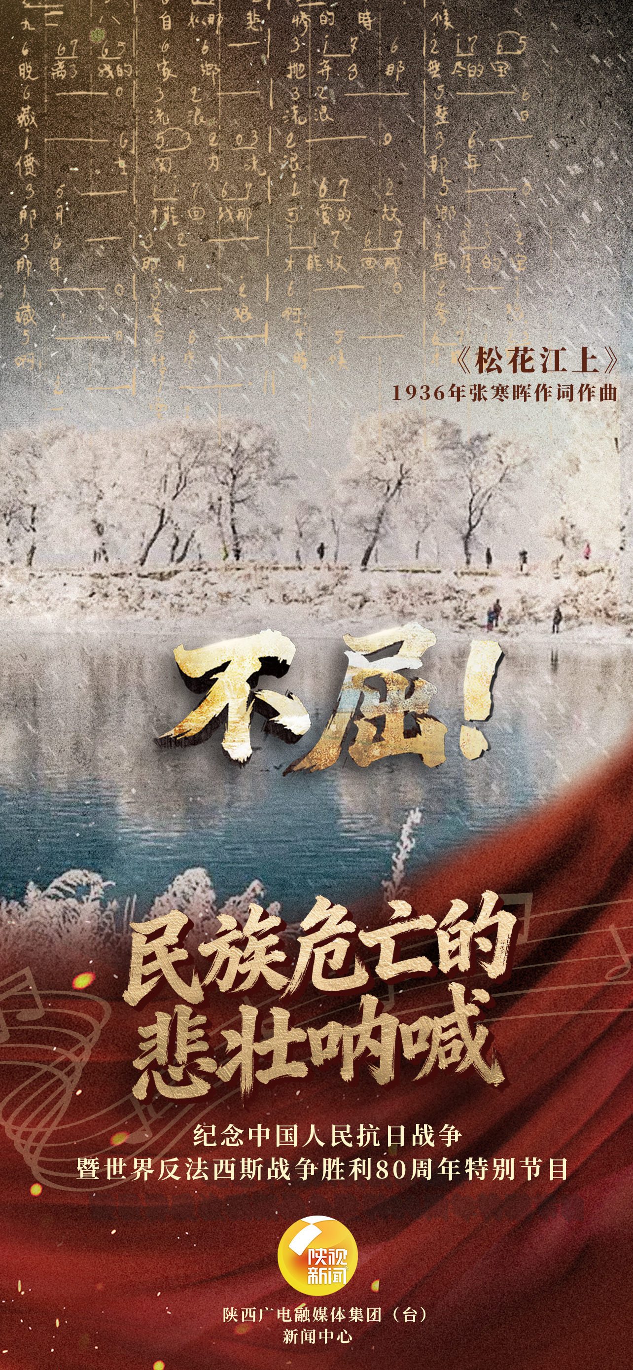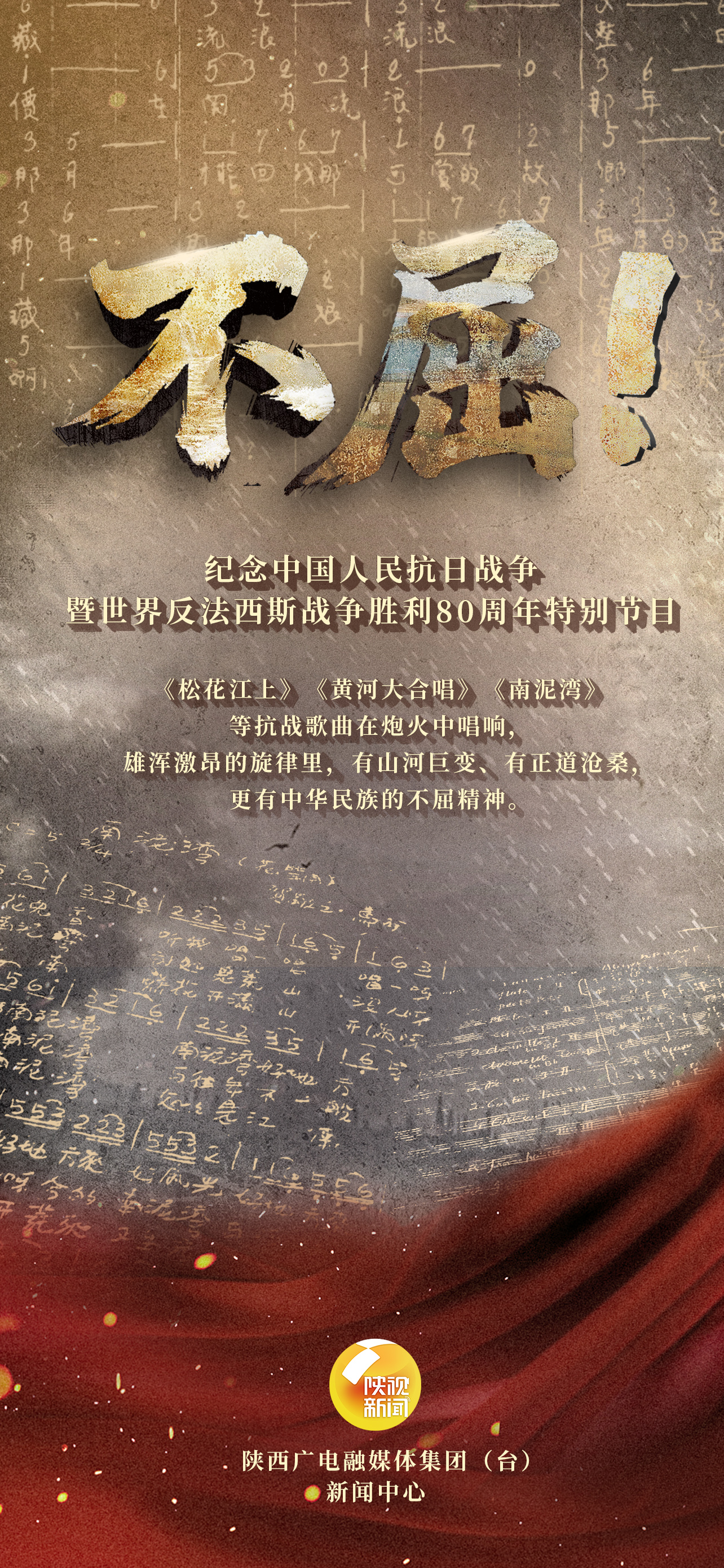 1931年9月18日,震惊中外的九一八事变爆发并成为中国人民抗日战争的起点,同时揭开了世界反法西斯战争的序幕。《松花江上》《黄河大合唱》《南泥湾》等抗战歌曲在炮火中唱响,雄浑激昂的旋律里,有山河巨变、有正道沧桑,更有中华民族的“不屈”精神。陕西广播电视台从今天起推出三集系列报道《不屈!》,让我们通过传唱不息、历久弥新的抗战歌曲“铭记历史、缅怀先烈、珍爱和平、开创未来”。