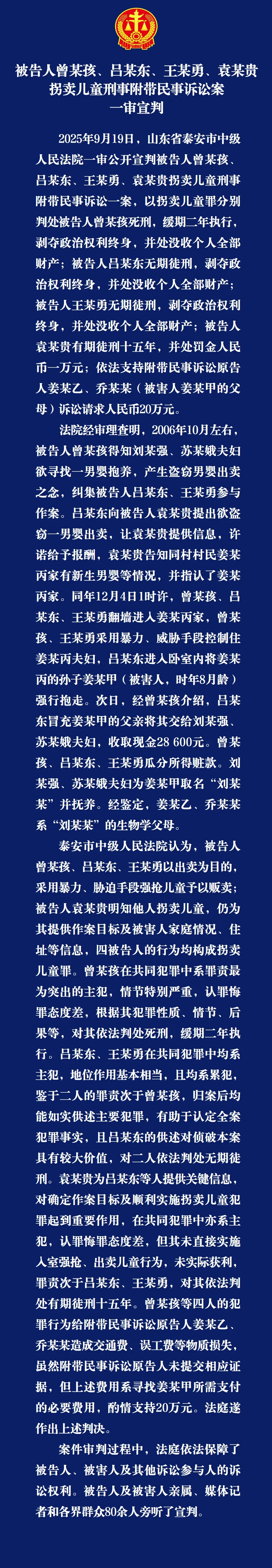 山东泰安“入室抢婴案”一审宣判,4名被告最高获死缓