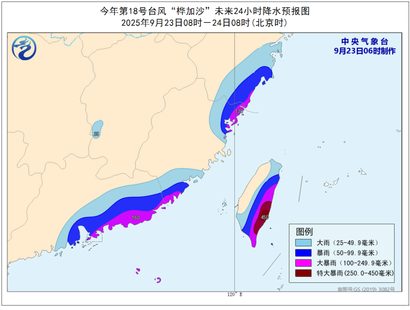 降水预报:23日8时至24日8时,台湾岛中东部及广东中部和东部、福建东北部和东南部、浙江东南部等地有大到暴雨,其中,广东东部、福建东北部和东南部、浙江东南部等地的沿海地区以及台湾岛东部有大暴雨,局地特大暴雨(250至450毫米)。
