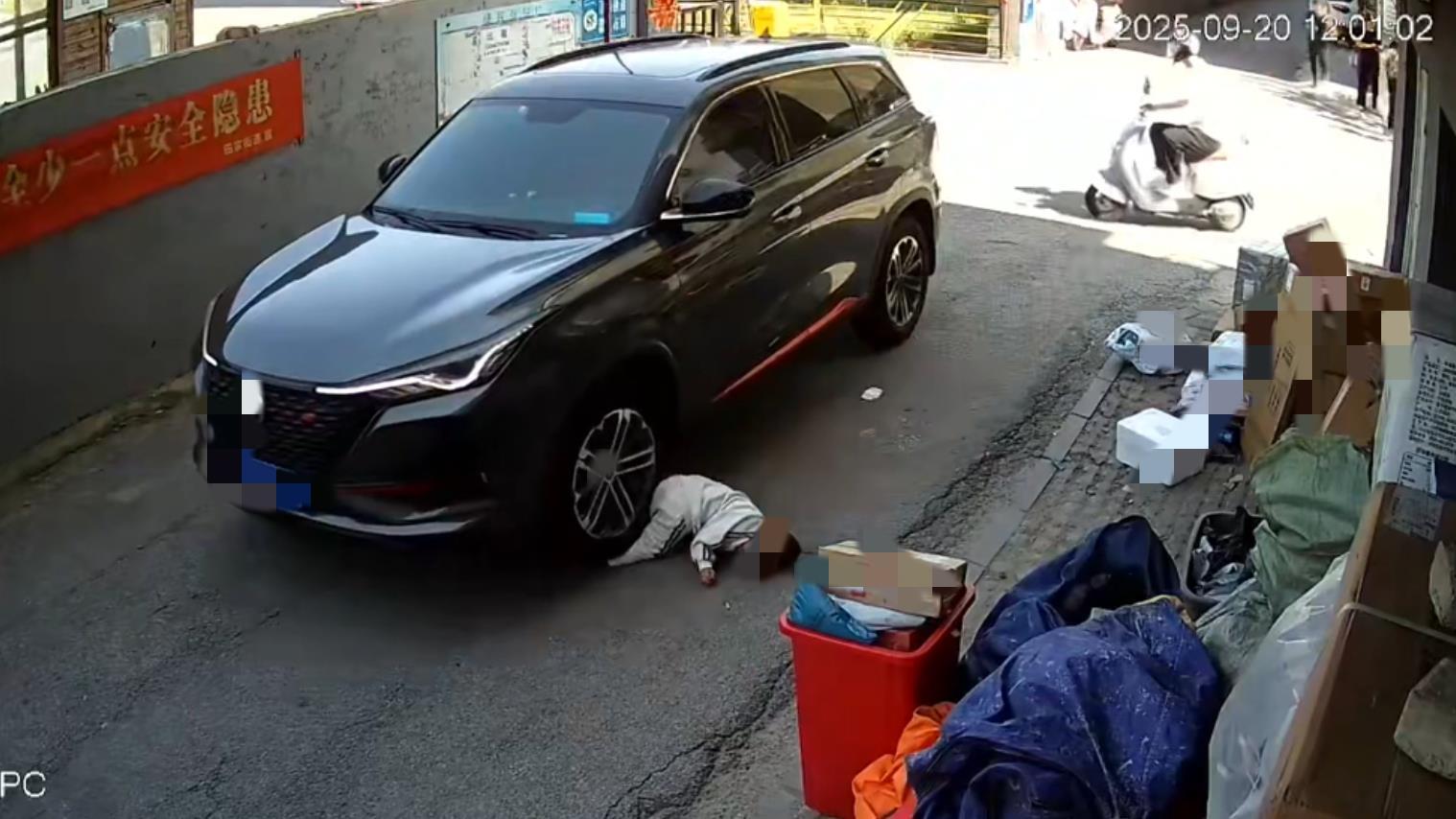 男童蹲地玩耍时被汽车碾轧,10多名路人抬车50秒救出,交警:孩子皮外伤,是否有视野盲区待调查