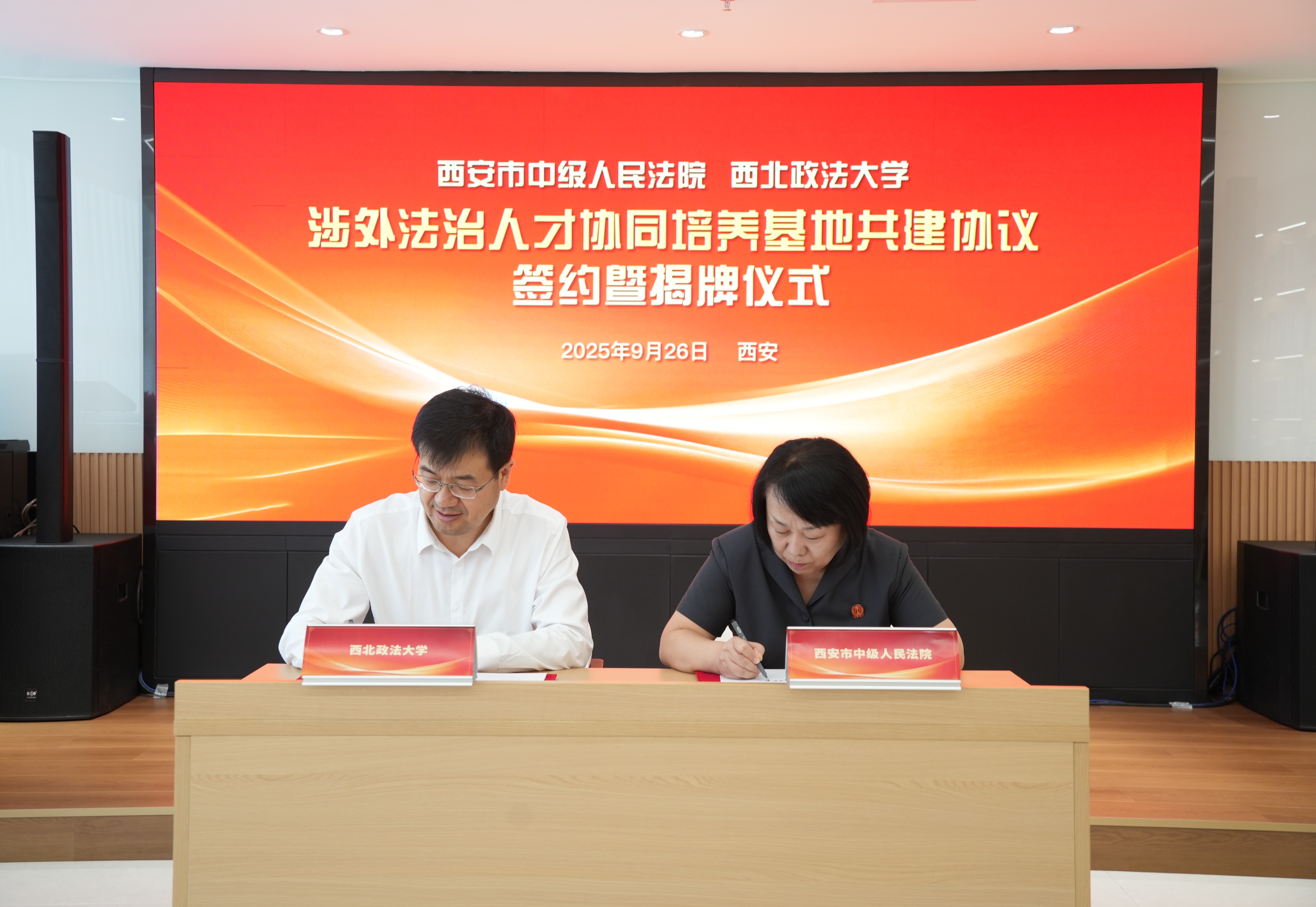 9月26日,西安市中级人民法院与西北政法大学举行《涉外法治人才协同培养基地共建协议》签约暨“涉外法治人才协同培养基地”揭牌仪式。双方将以“加强高校与法院涉外法治人才双向交流与合作,实现资源共享,培养复合型高素质涉外法治人才”为合作总则,通过共建协同培养基地、开展理论与实践互补交流等合作方式,加强学校与法院之间的良性互动,从人才培养、理论研究、学术交流、智库共享等方面开展院校合作。