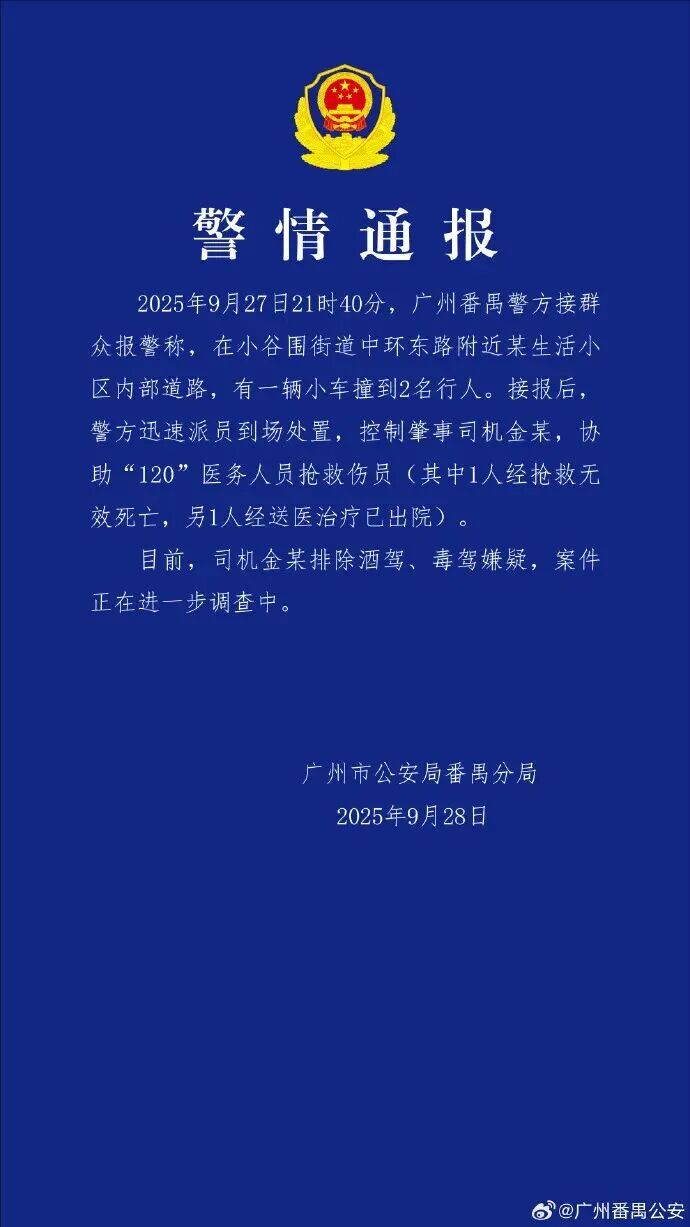 2025年9月27日21时40分,广州番禺警方接群众报警称,在小谷围街道中环东路附近某生活小区内部道路,有一辆小车撞到2名行人。接报后,警方迅速派员到场处置,控制肇事司机金某,协助“120”医务人员抢救伤员(其中1人经抢救无效死亡,另1人经送医治疗已出院)。