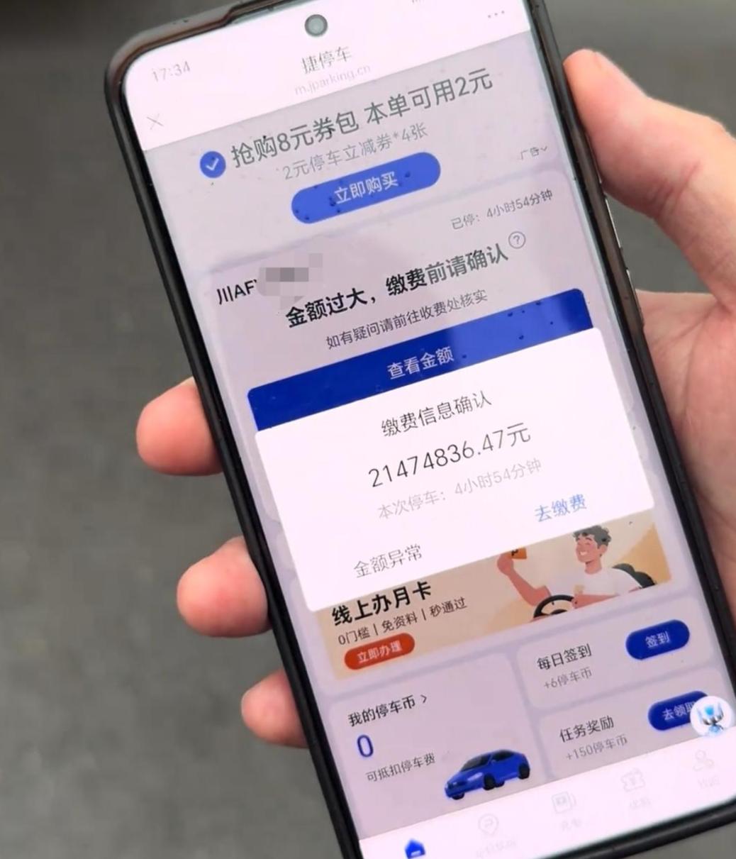 该视频显示,一辆车停放在停车场内,当事人手机上“捷停车”缴费提示单显示该车辆停车时间为4小时54分,需支付21474836.47元,并提示“金额过大,缴费前请确认”等。“捷停车”的另一页面还显示,停车入场时间为9月27日12时39分。