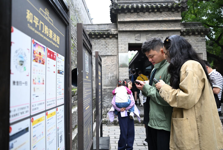 10月3日,游客在西安城墙和平门出入口扫码购票。
