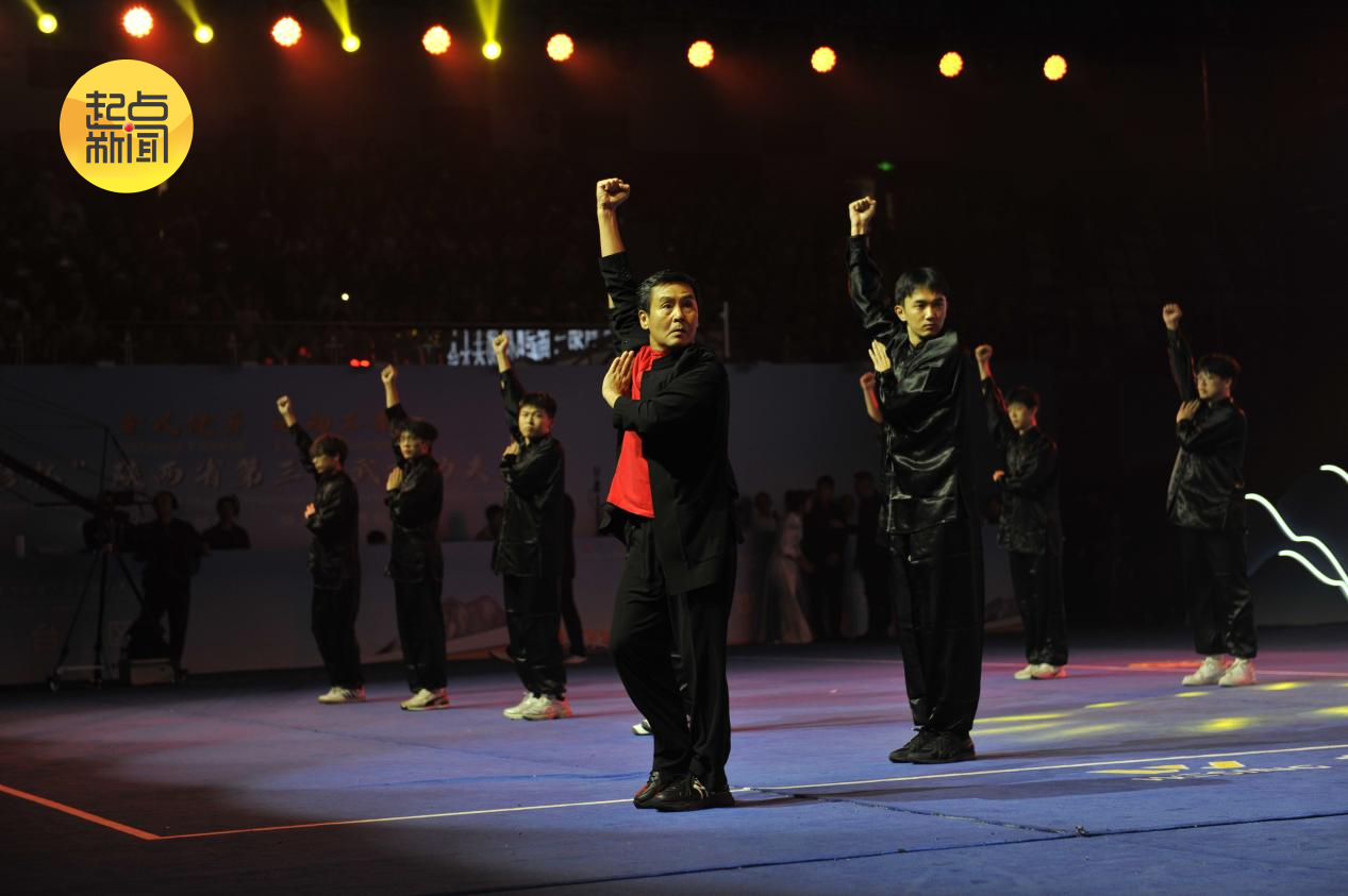 在文艺表演环节,刚柔并济的太极、高亢磅礴的华阴老腔、粗犷豪放的富平老庙老鼓,三者交融共同呈现出黄土地上深厚的文化底蕴。著名武术家赵长军携古装武侠剧《一刀倾城》中的老搭档杨凡登场,重现影片中的经典桥段。随后,赵长军以一套刚劲有力、技法精湛的红拳表演,尽显陕西本土拳种的独特魅力。紧接着,武打影视导演、歌手徐小明献上经典名曲《万里长城永不倒》与《男儿当自强》。昂扬的旋律中,青少年武术队员拳脚生风,棍影翻飞,展示了中国年轻一代的铮铮铁骨与自强不息的精神,将现场氛围推向高潮。