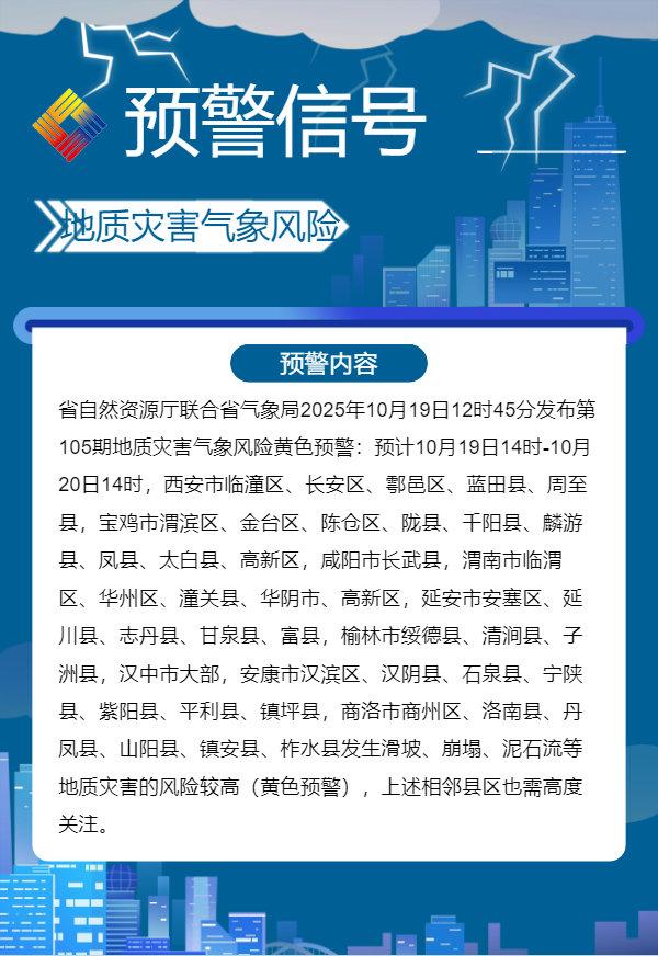 预计10月19日14时至10月20日14时,西安市临潼区、长安区、鄠邑区、蓝田县、周至县,宝鸡市渭滨区、金台区、陈仓区、陇县、千阳县、麟游县、凤县、太白县、高新区,咸阳市长武县,渭南市临渭区、华州区、潼关县、华阴市、高新区,延安市安塞区、延川县、志丹县、甘泉县、富县,榆林市绥德县、清涧县、子洲县,汉中市大部,安康市汉滨区、汉阴县、石泉县、宁陕县、紫阳县、平利县、镇坪县,商洛市商州区、洛南县、丹凤县、山阳县、镇安县、柞水县发生滑坡、崩塌、泥石流等地质灾害的风险较高(黄色预警),上述相邻县区也需高度关注。