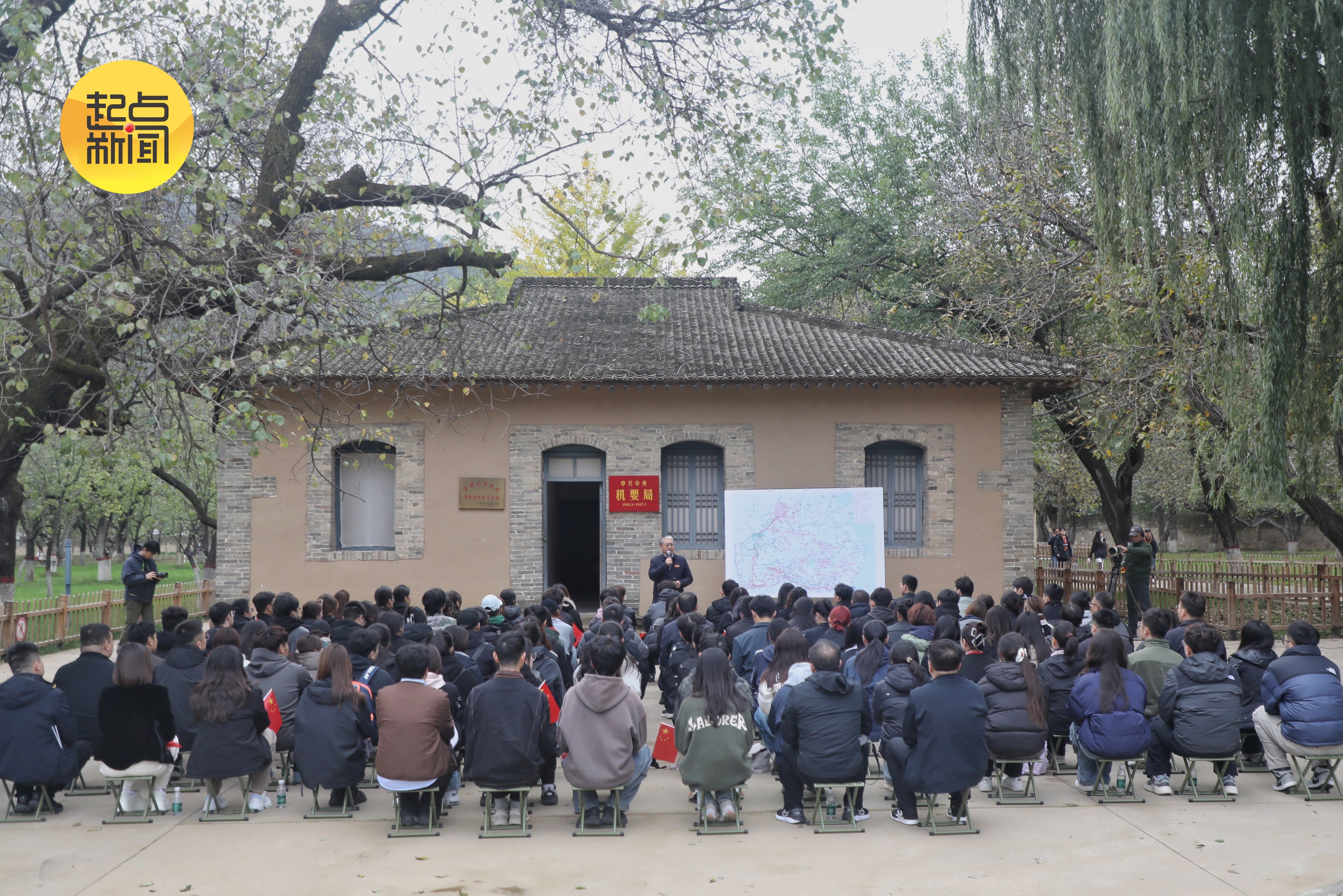 在金色银杏和绿色垂柳的掩映下,在中共中央机要局旧址前,青年们同上一堂思政课。陕西省委党校教授毕远佞以《红军长征的辉煌历程与伟大意义》为题,向来访的青年学生们讲述了中国工农红军长征的历史背景、过程和结果,以及长征的历史意义和当前意义。