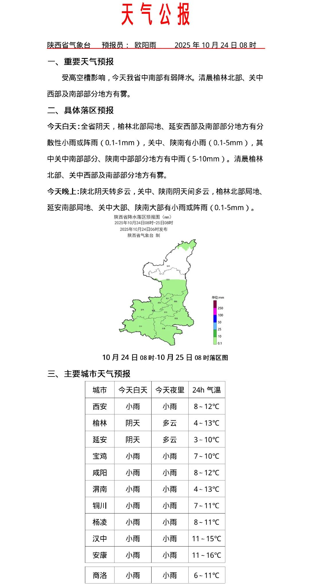 陕西省气象台2025年10月24日08时发布天气公报