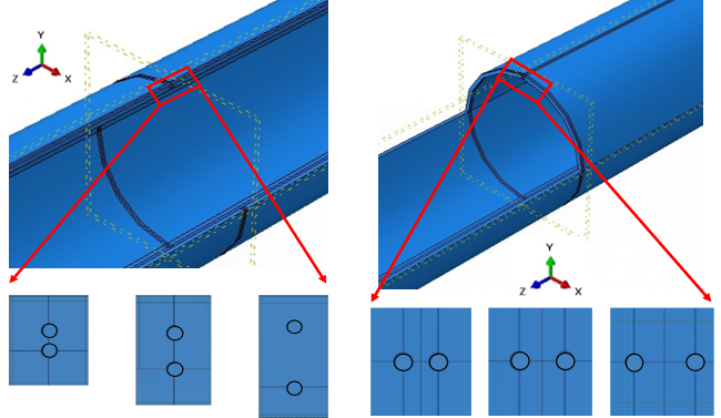 基于这一思路,团队构建了多个不同腐蚀坑大小的海底管道数值模型,系统研究了不同腐蚀坑尺寸、位置、双坑团聚度、坑间距及非均质群坑相互作用等影响因素对腐蚀疲劳裂纹萌生寿命和扩展路径的影响,揭示了管道在腐蚀疲劳作用下从损伤产生、裂纹扩展直至失效的全过程演化行为。