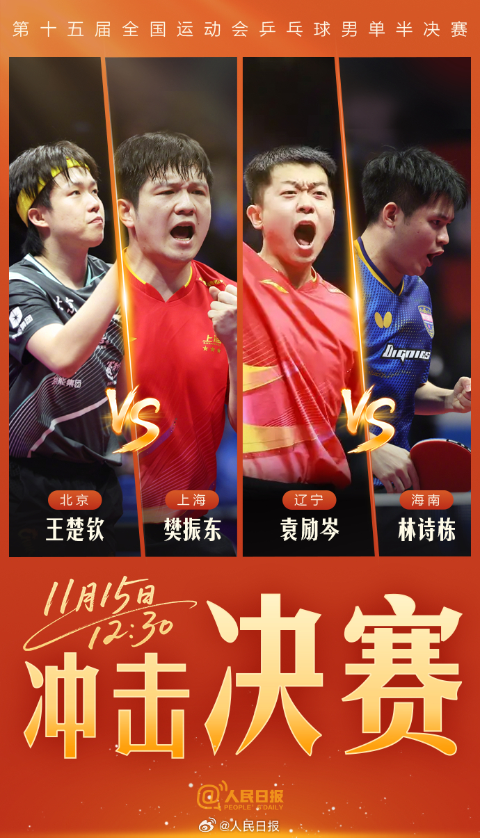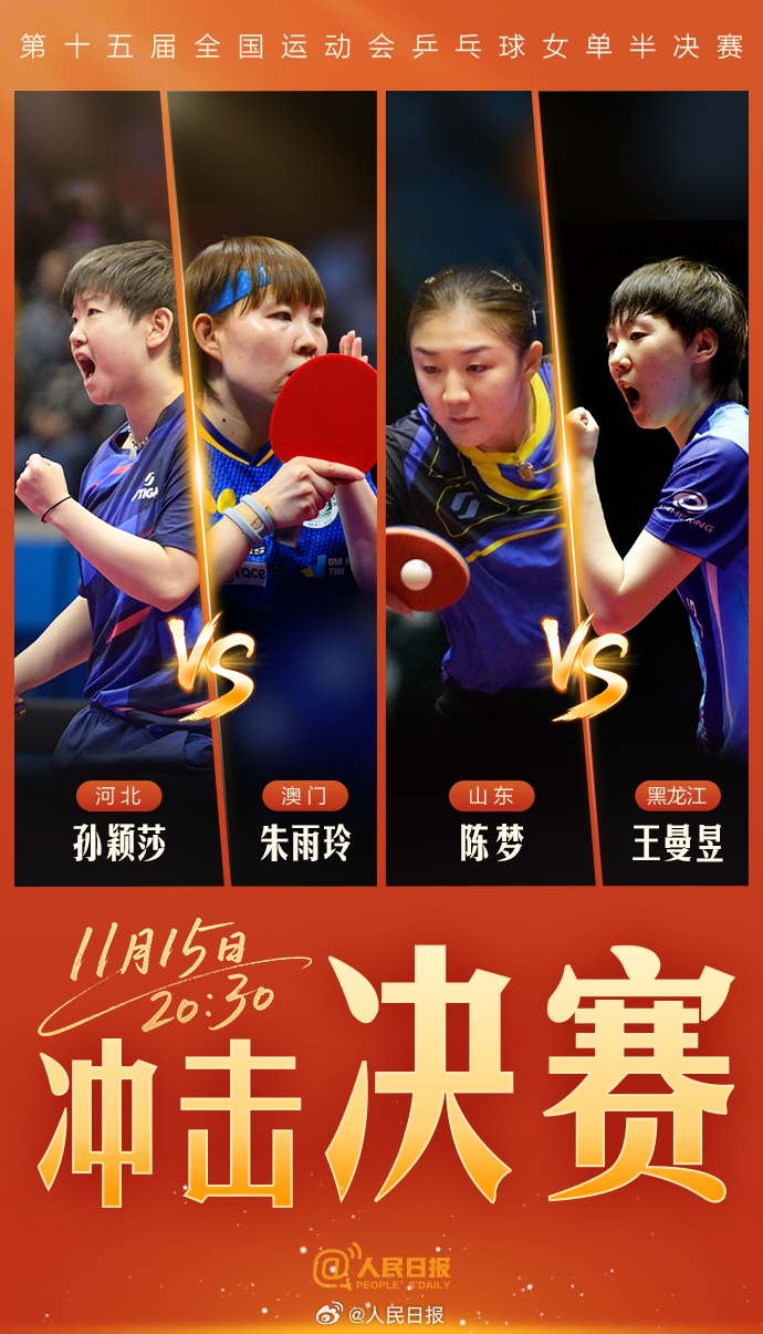11月15日,第十五届全国运动会乒乓球半决赛将进行,为运动员们加油!