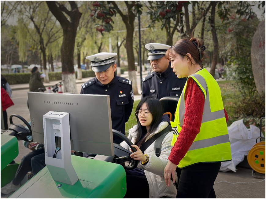 西北政法大学校园内氛围浓厚,室外报告厅门前广场早早搭建起宣传阵地,布置宣传展板、VR安全体验设备及交警文创礼品,交管长安大队民辅警与各单位工作人员并肩行动,向过往师生发放交通安全宣传手册,面对面解读交通法律法规,结合典型案例剖析交通陋习危害,同步设置交通知识问答、VR沉浸式体验等趣味环节,以群众喜闻乐见的方式让安全常识入脑入心,现场参与师生踊跃互动,在轻松氛围中夯实安全出行认知。
