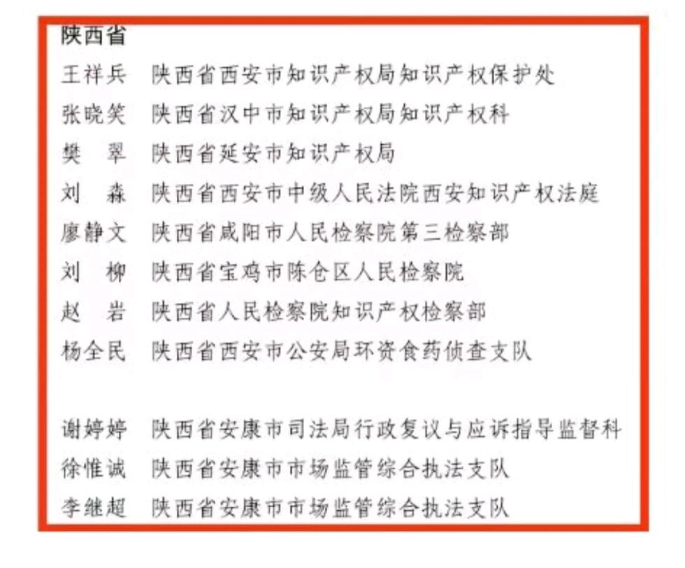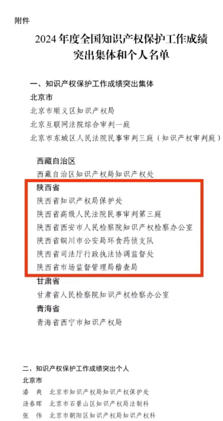 陕西获通报表扬的6个集体分别为:陕西省知识产权局保护处、陕西省高级人民法院民事审判第三庭、西安市人民检察院知识产权检察办公室、铜川市公安局环食药侦支队、陕西省司法厅行政执法协调监督处、陕西省市场监督管理局稽查局。西安市知识产权局知识产权保护处王祥兵、西安市中级人民法院西安知识产权法庭刘淼、安康市市场监管综合执法支队李继超等11人为全国知识产权保护工作成绩突出个人。