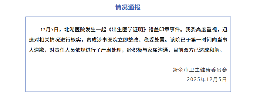 12月5日,北湖医院发生一起《出生医学证明》错盖印章事件。我委高度重视,迅速对相关情况进行核实,责成涉事医院立即整改、稳妥处置。该院已于第一时间向当事人道歉,对责任人员依规进行了严肃处理,经积极与家属沟通,目前双方已达成和解。