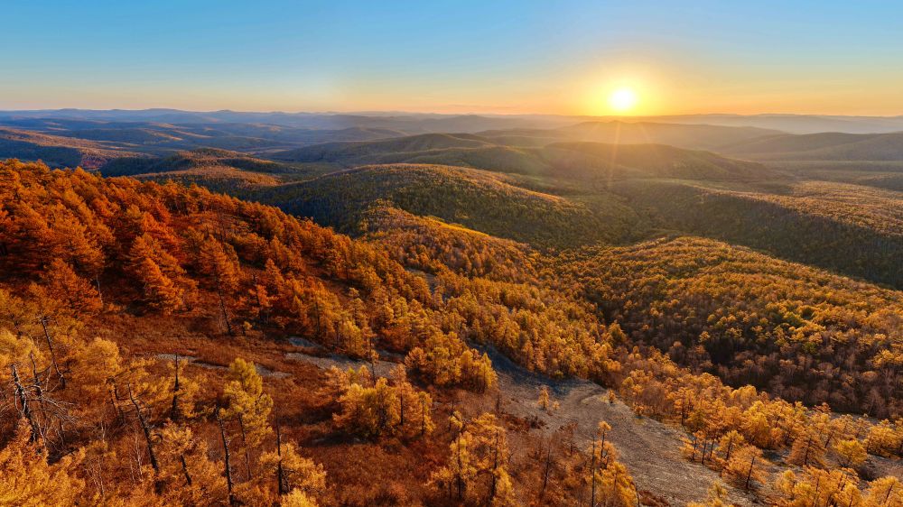 这是2025年9月28日在内蒙古牙克石市绰河源镇拍摄的大兴安岭林海日出(无人机拼接照片)。新华社记者 马金瑞 摄