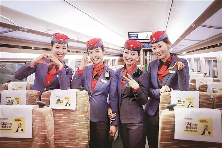 西延高铁首发列车计划为CR400BF-Z型复兴号智能动车组列车,中国铁路西安局集团有限公司西安客运段精心选拔业务能力强、综合素质高的乘务员担当值乘任务。乘务员身穿紫蓝色套装,搭配具有东方特色版型设计的浅蓝色毛呢大衣,点缀亮眼的红色纽扣。西安客运段围绕服务礼仪、沟通用语及服务技巧等方面,对乘务组进行强化培训,给旅客带来最佳乘车体验。他们还针对西延高铁沿线西安、铜川、延安等城市开展红色文化讲解,沿线景点推介等特色服务培训。此外,乘务组还对列车服务箱进行升级,增添常用药品、充电线等实用日常用品,满足旅客需求。