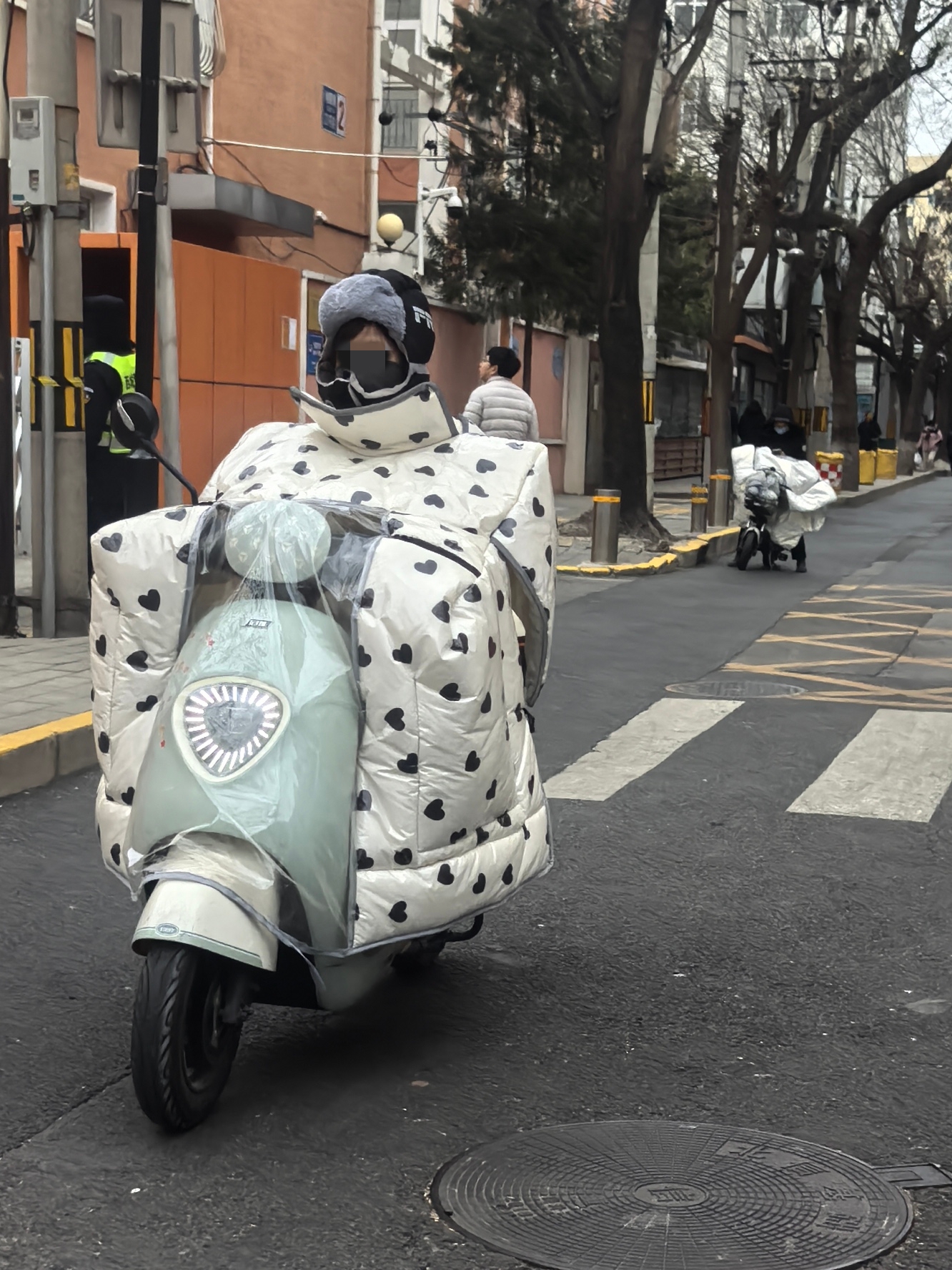 像张女士这样选择“高配版”挡风被的骑行者不在少数。其中,有骑行者整个身体被宽大的挡风被包得严严实实。两侧延伸出的护肩部分,与前方围挡形成一个近乎密闭的“小房子”。