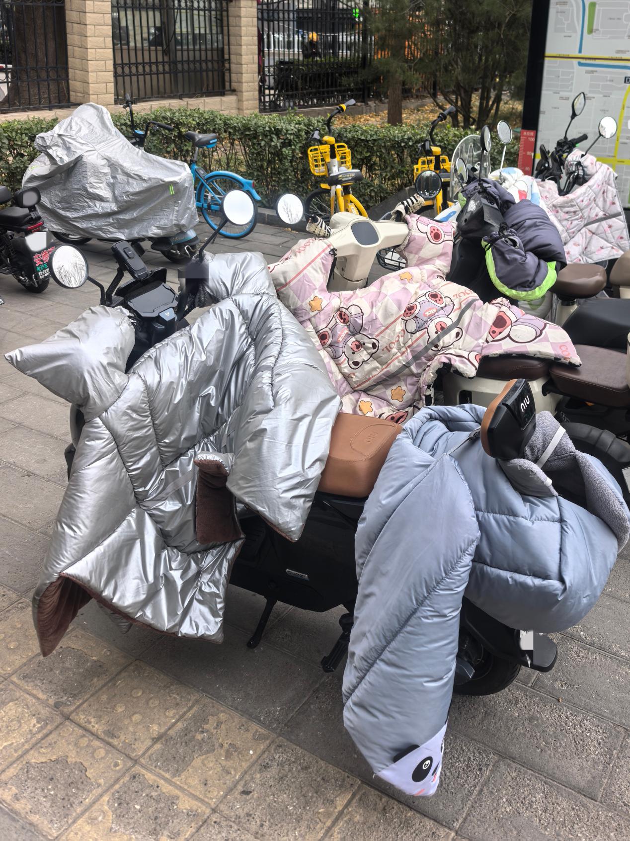 早上8点,西城区三里河东路与复兴门外大街交叉口,一拨又一拨电动自行车往来穿梭。刺骨的寒风中,多数骑行者选择“全副武装”,而挡风被俨然已经成为“标配”。
