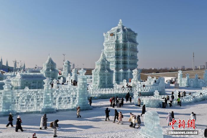 12月17日,第二十七届哈尔滨冰雪大世界开园。图为白天景观,游客在黄鹤楼主题冰建区域游玩。