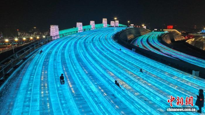 12月17日,第二十七届哈尔滨冰雪大世界开园,图为游客体验521米超级冰滑梯。 于琨 摄