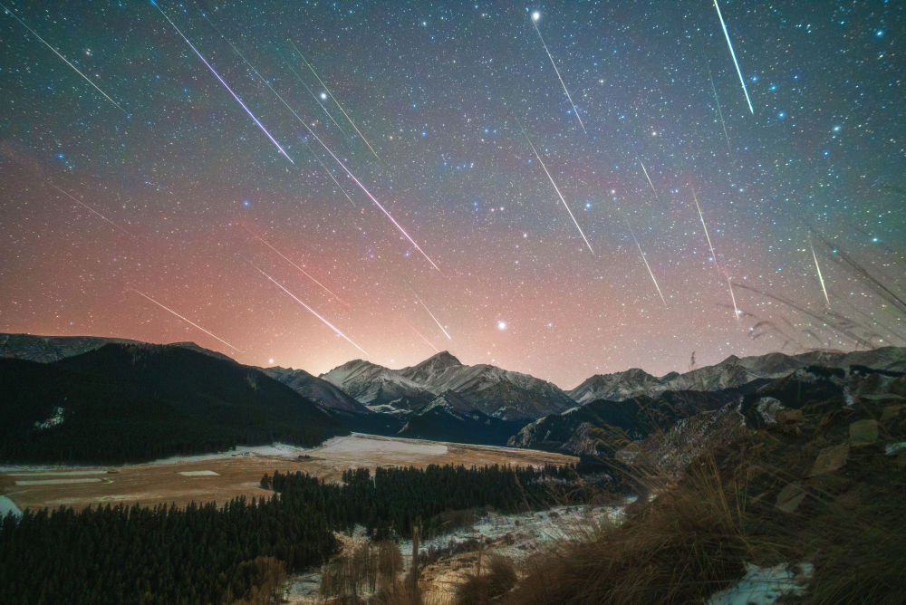 2025年12月14日,在甘肃武威拍摄的双子座流星雨(多张叠加)。(李硕摄,星联CSVA供图)
