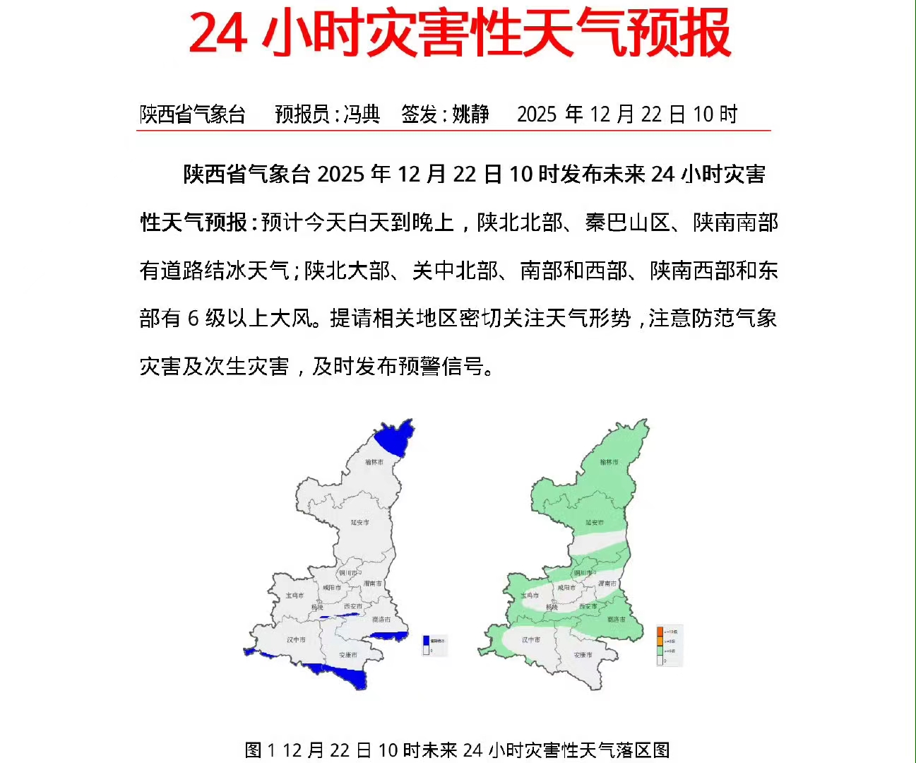 陕西省气象台2025年12月22日10时发布未来24小时灾害性天气预报:预计今天白天到晚上,陕北北部、秦巴山区、陕南南部有道路结冰天气;陕北大部、关中北部、南部和西部、陕南西部和东部有6级以上大风。提请相关地区密切关注天气形势。