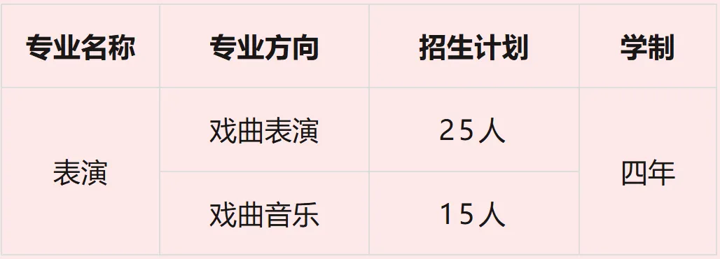 2026年我校戏曲类专业拟面向全国招收全日制本科生40名,不编制分省计划,文理兼收,不限选考科目,专业课成绩采用普通高等学校戏曲类本科专业省际联考成绩,不单独组织校考。具体情况如下: