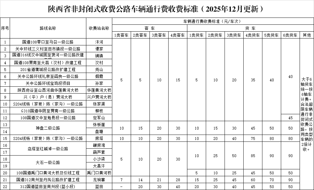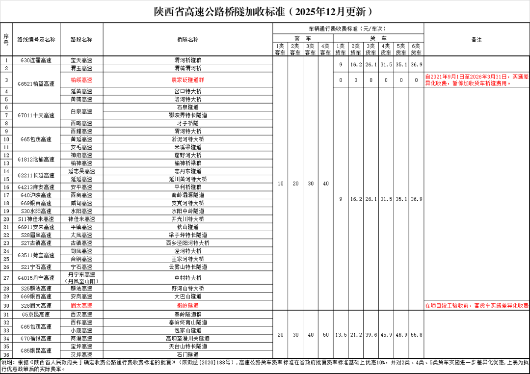 按照《陕西省人民政府关于确定收费公路通行费收费标准的批复》(陕政函〔2020〕188号)、《陕西省交通运输厅 陕西省发展和改革委员会 陕西省财政厅关于转发〈陕西省人民政府关于确定收费公路通行费收费标准的批复〉的通知》(陕交发〔2021〕5号)等文件精神,现将陕西省收费公路车辆通行费收费标准及相关内容汇总如下: