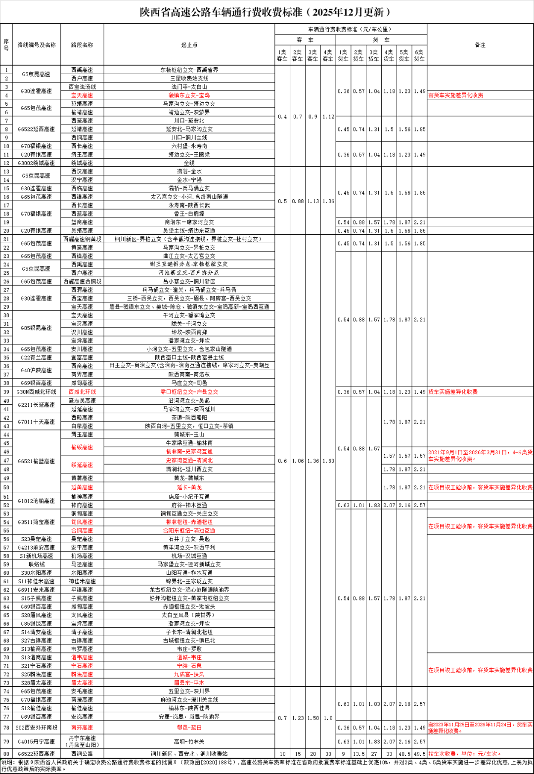 (五)在项目竣工验收前,行驶G6521榆蓝高速延长至黄龙高速公路、G3511菏宝线合阳至铜川段、G3511菏宝线旬邑至凤翔段、澄商线澄城至韦庄、宁陕至石泉、麟游至法门寺、眉县至太白等7条高速的所有客货车辆,暂执行1类车0.60元/车公里对应的费率标准(省政府批准为1类车0.70元/车公里对应的费率标准)。